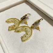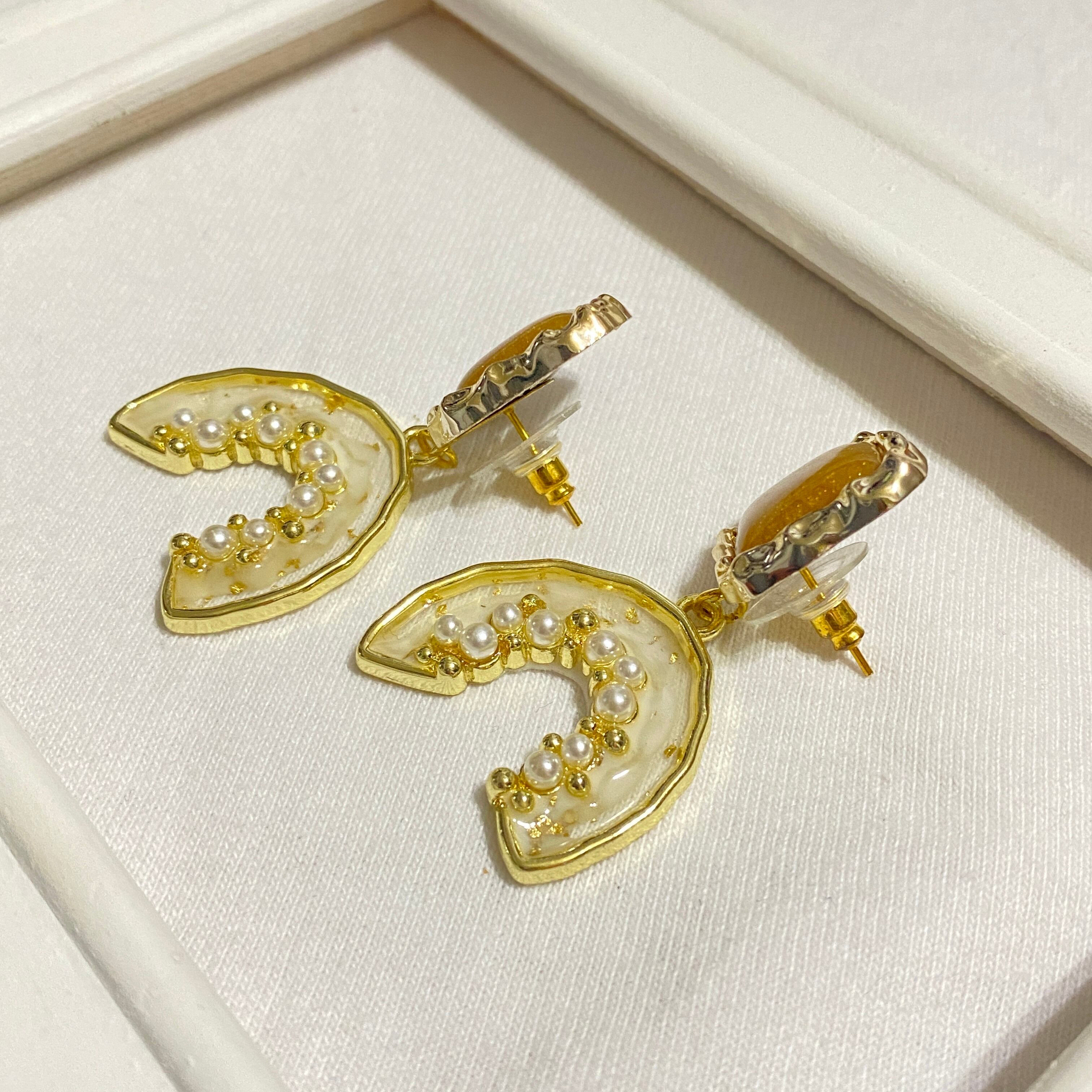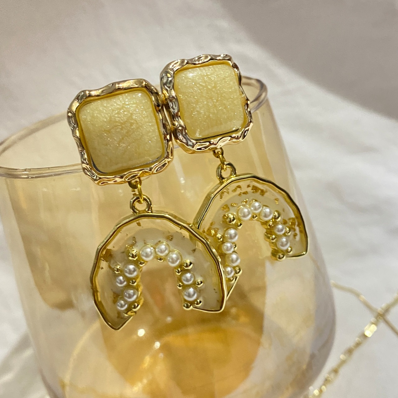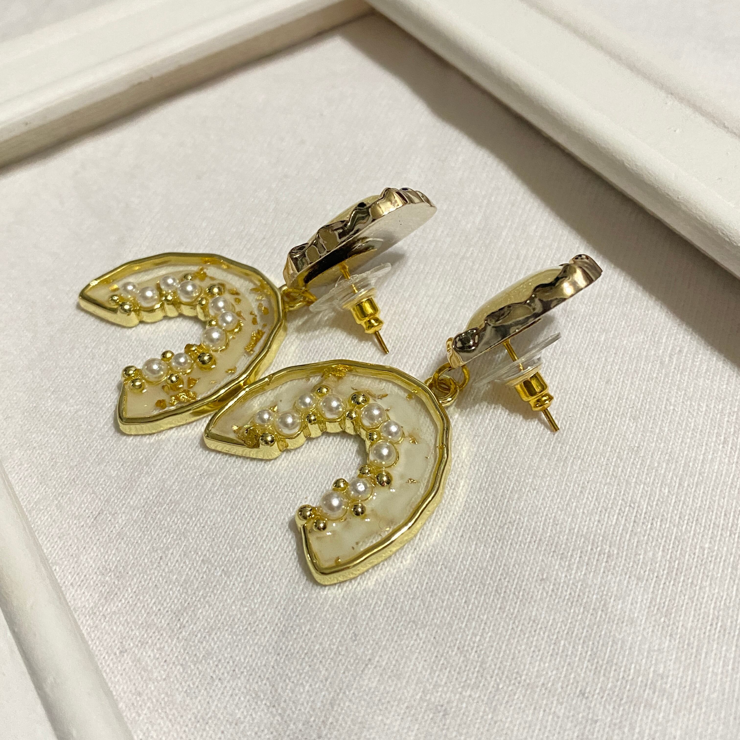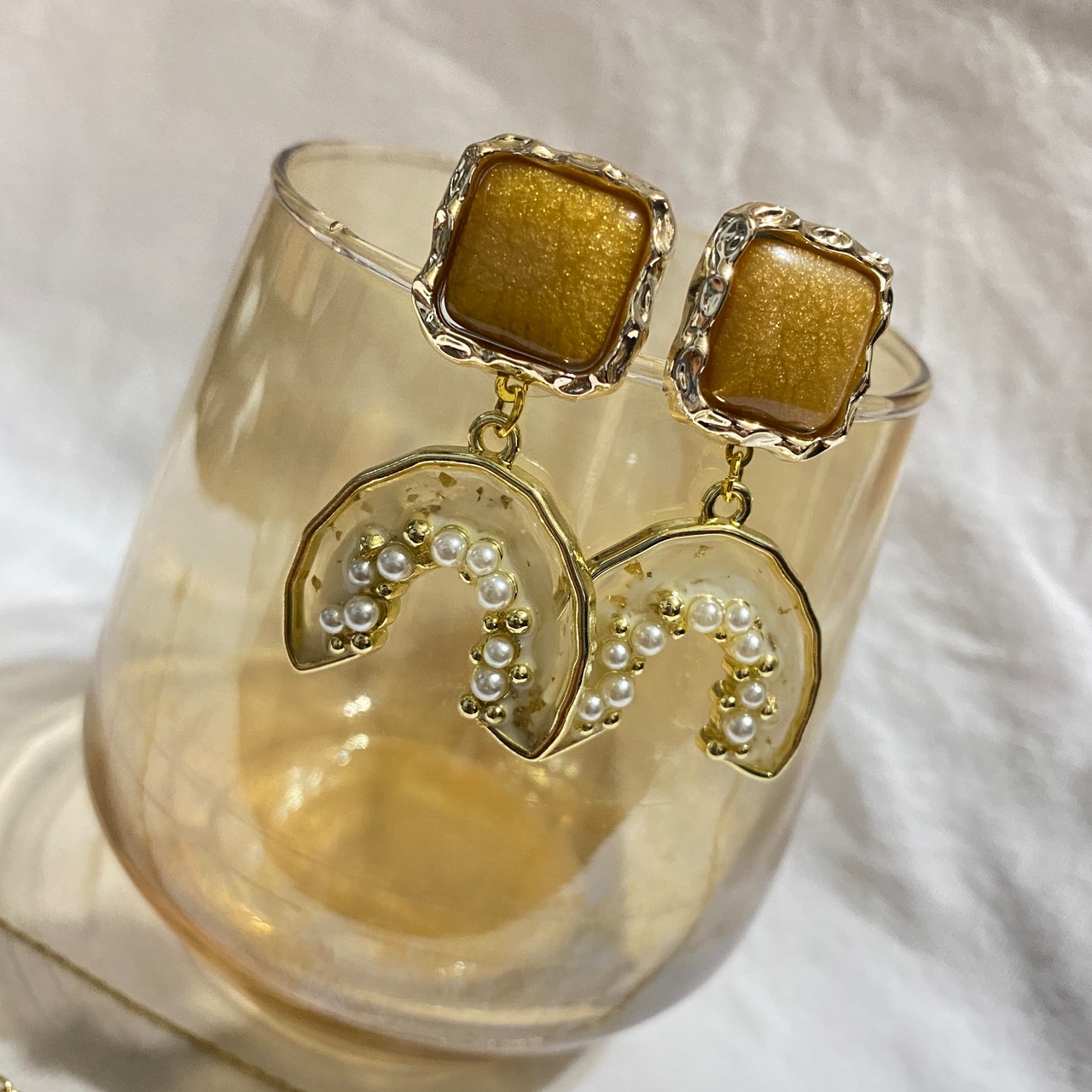 スクエアカボションと金箔や小さなパールが使用されたインポートパーツの組み合わせが女性らしいピアス。